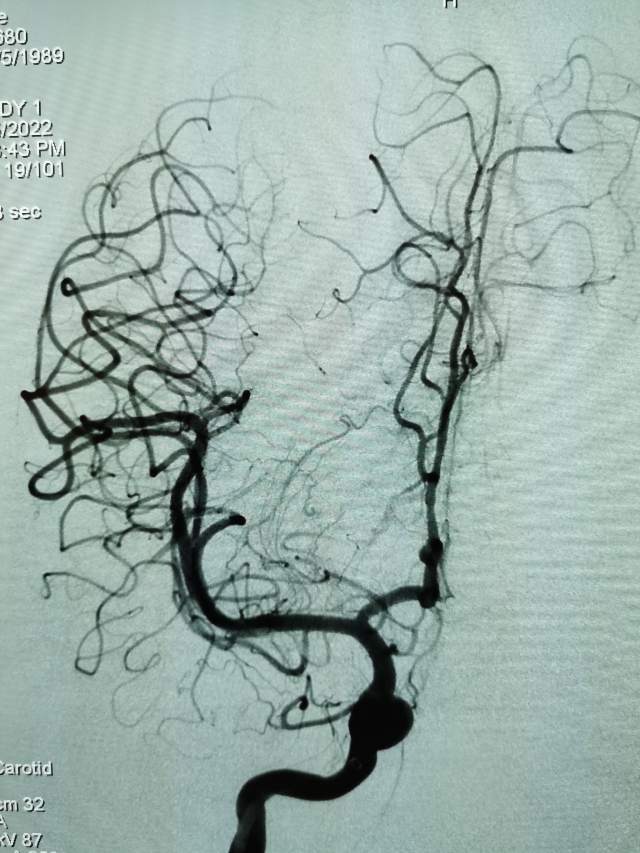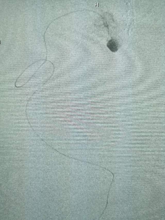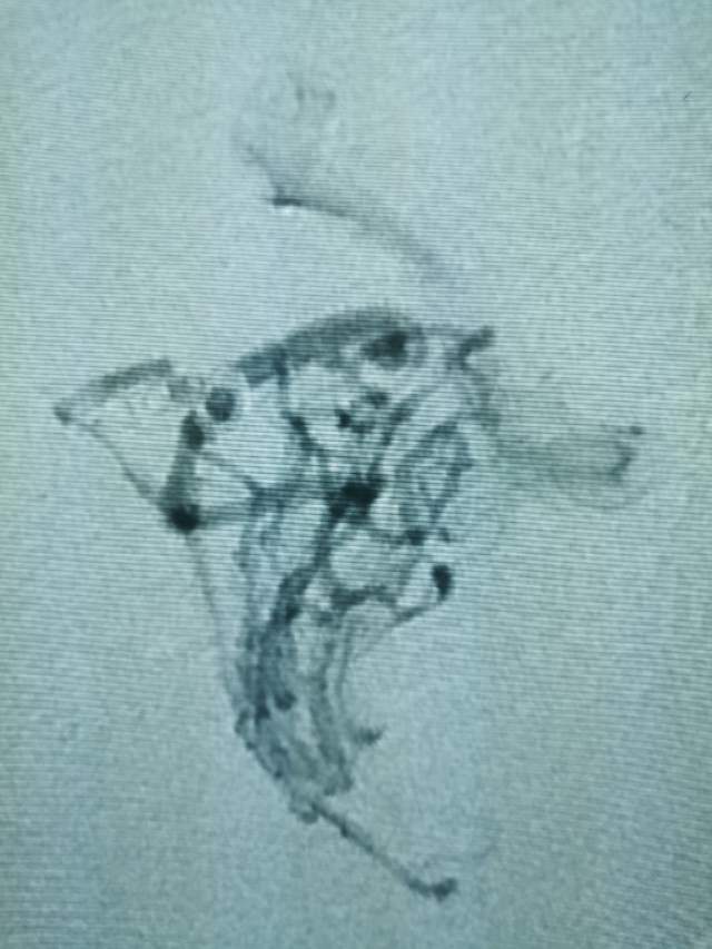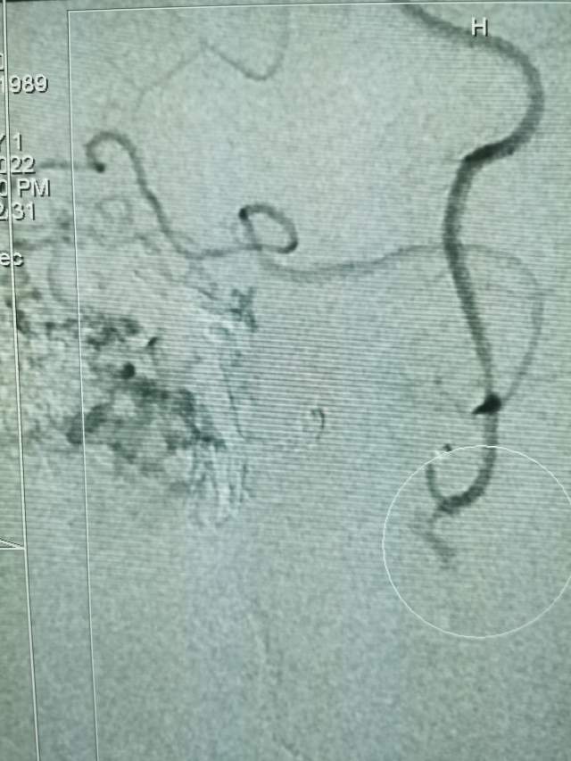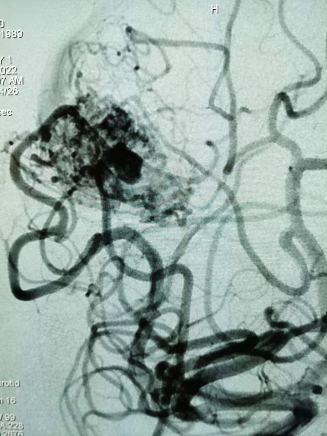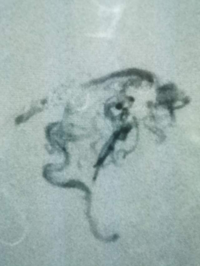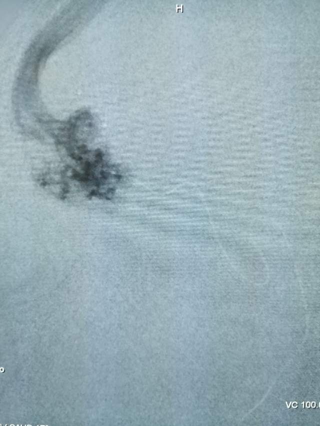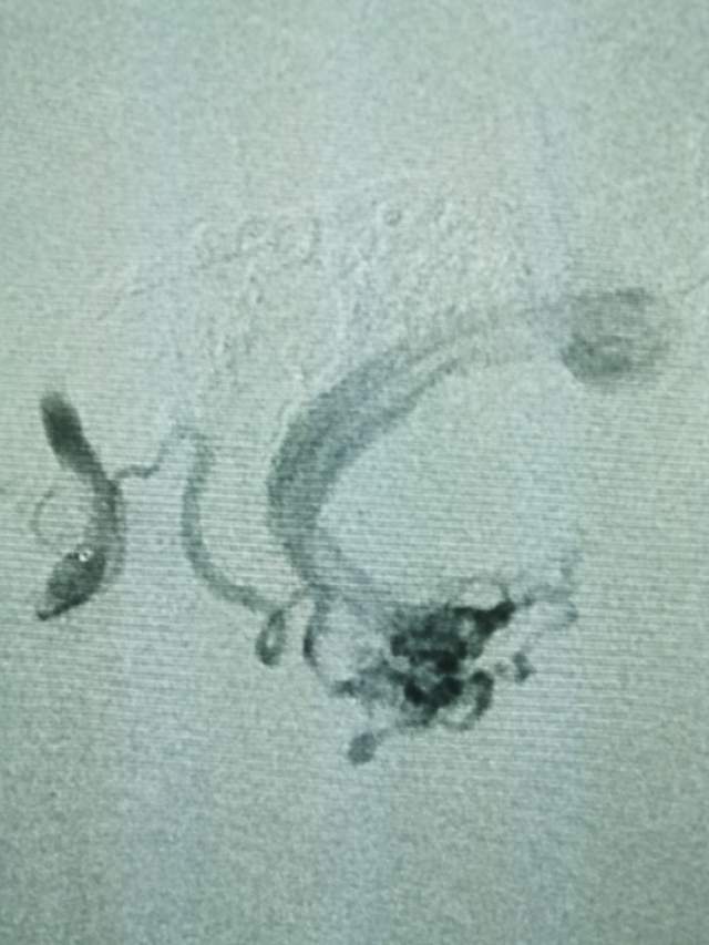 第一次手术:我们先超选6个分支小血管给予栓塞,去其枝叶,保留主干,结构逐步显山露水,清晰可见引流静脉的起始部,为二期手术做足准备~~~