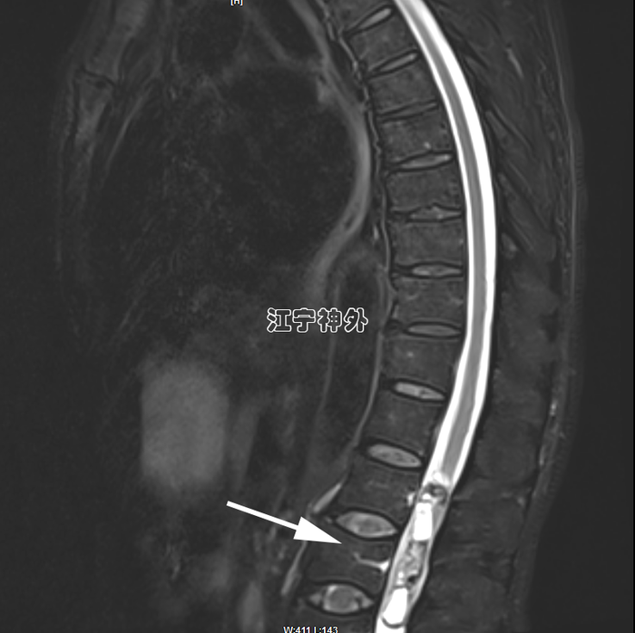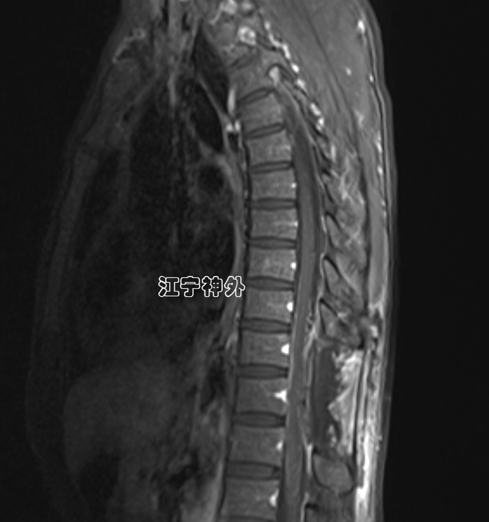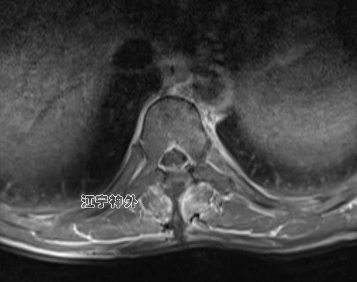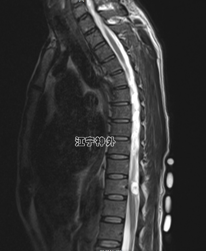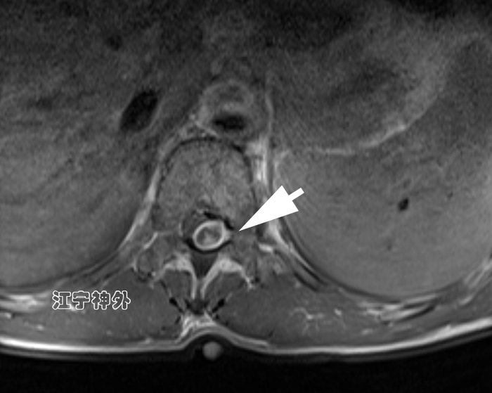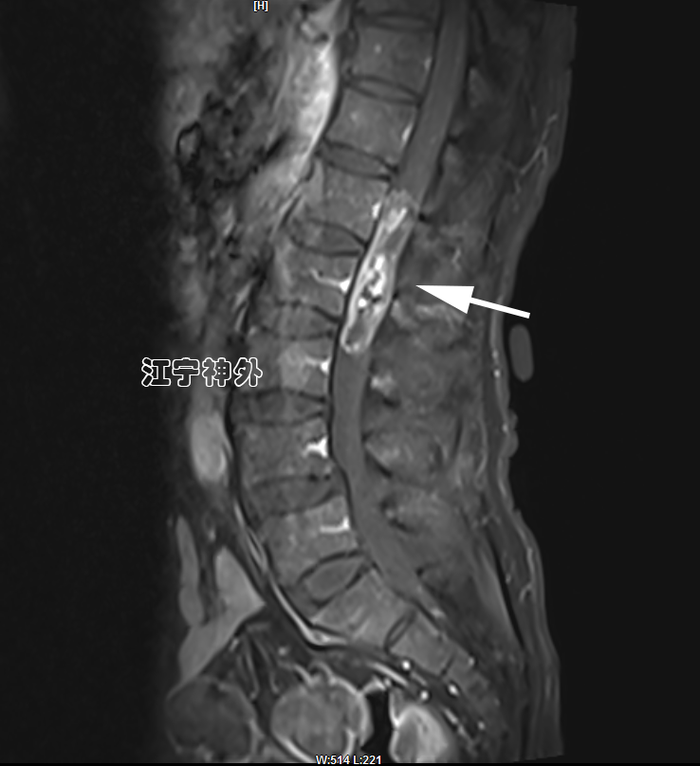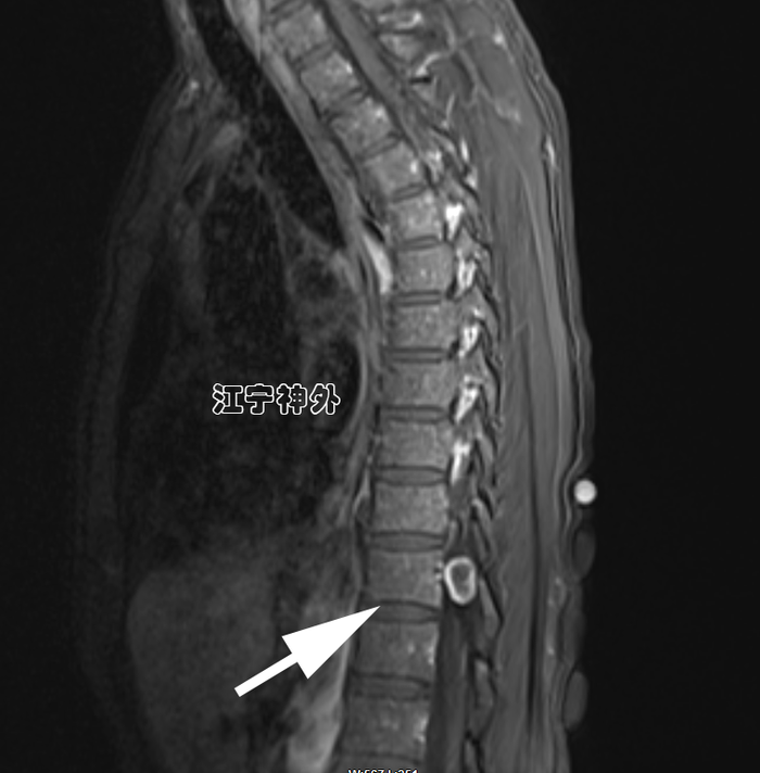 郑主任阅片发现,肿瘤位于胸10水平,属于髓外硬膜下病变,增强不均匀,边界清晰,位于脊髓的左后,脊髓被推向右前方。