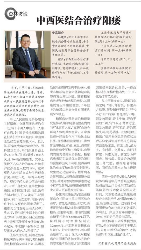 中西医结合治疗阳痿 2018年09月15日 8287人阅读 返回文章列表 上海市第七人民医院男科用中西医结合方法治疗阳痿病 ,取得满意疗效 获得上海市浦东新区卫计委授牌,并成为特色推广项目 上海市第七人民医院男科科室标识 顶 0 分享到: