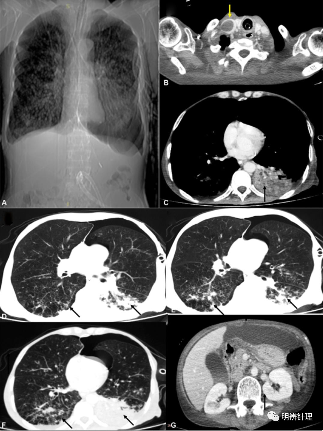 男性,60岁,长期接受哮喘类固醇治疗。最近进行了十二指肠穿孔手术,随后出现呼吸窘迫。CT显示慢性阻塞性肺病,双侧下叶浸润。增强CT ( B ) 显示右侧颈内静脉(黄色箭头)和左侧下叶实变(黑色箭头)( C ) 中的血栓。肺窗 ( D–F ) 显示双侧下叶混浊(黑色箭头),确认误吸。上腹部显示并存脓腹 ( G ),多灶性感染和败血症。