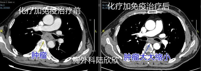 上图,肿瘤在化疗加免疫治疗3个周期后,缩小至治疗前的30%。术中见肿瘤缩小至治疗前的10%。