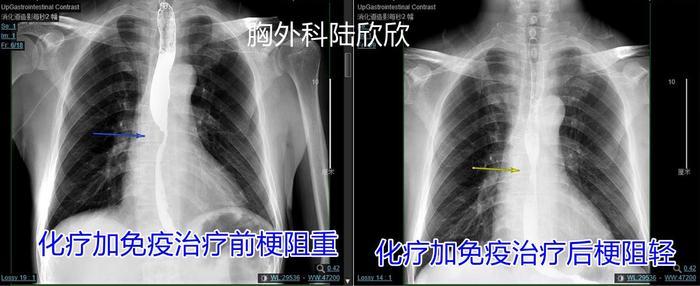 上图,肿瘤在化疗加免疫治疗3个周期后,上消化道造影可见肿瘤缩小,吞咽梗阻改善,可以吃干饭了。病人在术前3天,突然吞咽梗阻加重,有呕吐,术后见肿瘤很小,估计是肿瘤退缩的疤痕引起的呕吐。