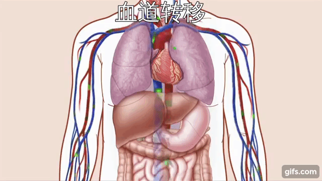 绿色的肿瘤细胞经过红色的小血管到达身体的全身各处,在别的器官着陆,形成远处转移