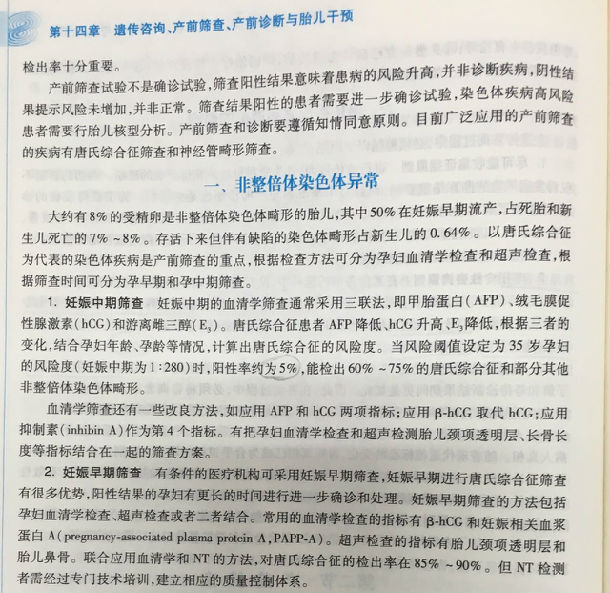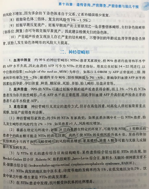 我们来看教科书中关于“产前筛查-神经管缺陷筛查”的数据:(摘自第八版妇产科教材)