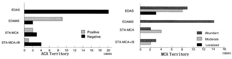 从图中看到,EDAMS相较EDAS有着更充分的骨窗,EDAMS比EDAS提供了更多的血供来源。日本的一家医院,总结了他们给烟雾病患者不同手术方式的临床结果。EDAS几乎无法向大脑前动脉(ACA)区域提供血流,在大脑中动脉(MCA)区域只有一半的病例得到了充分血流灌注。而EDAMS有一半的病例向大脑前动脉(ACA)区域提供血流,几乎所有的病例的大脑中动脉(MCA)区域得到了充分血流灌注。