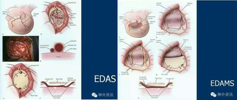 我们用儿童烟雾病的间接血管融合手术方式来论述,脑-硬膜-颞前动脉动脉贴附术(EDAS)、脑-硬膜-颞肌-颞前动脉贴附术(EDAMS)。