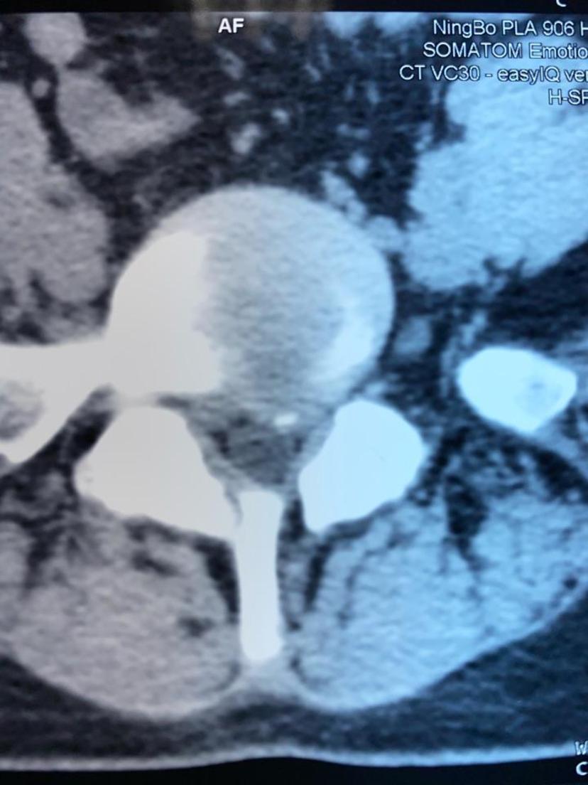CT显示突出钙化的椎间盘压迫左侧神经根
