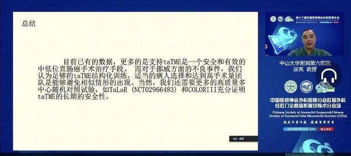 本次会议是一次简短、高效、既有高度又有广度的结直肠肛门外科领域的学术盛会。无论是结直肠癌手术的进展与难点、taTME手术还是肛肠良性疾患的讲座都赢得了网络平台上的高度认可和一片叫好声。通过这次线上学术会议的成功举办,既展现中国结直肠肛门外科的风采,又与国外同道进行了友好的互动交流,为我国结直肠肛门外科的发展提供了有益的支持。