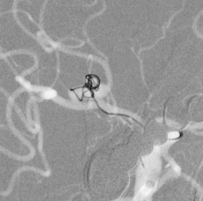 话归正传,下面我们看看如何分兵使用“犄角之势”的策略夹击栓塞“犄角之势”的硬骨头(分叉部绝对宽颈带有俩角的动脉瘤):两个微导管先后到位,两个子囊内的弹簧圈相互依偎,形成“犄角之势”,共同击杀两者之间的大本营(共同的瘤体),最终致密栓塞动脉瘤,消除了动脉瘤再次兴风作浪(再出血)的风险,也最大限度的保全了各个分支血管(粮道)的安全,急性期也没有使用支架,降低了费用,还保障了安全。