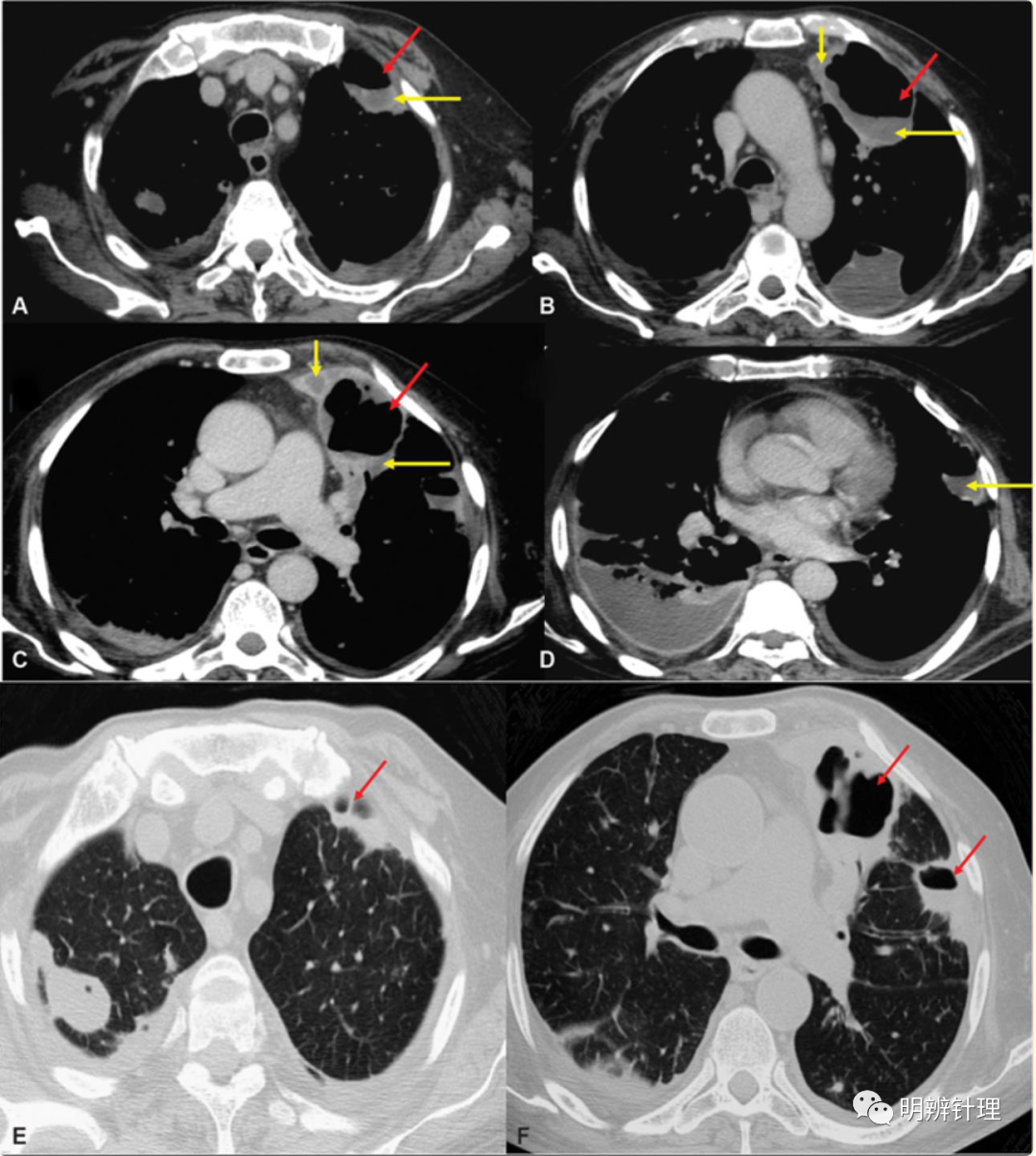 男性,57岁,咳嗽、发烧和呼吸窘迫2周,糖尿病病史控制不佳。增强CT ( A–D ) 显示多段坏死性实变(红色箭头),低强化肺实质(黄色箭头)。双侧脓胸。肺窗( E、F )显示肺实变伴空洞(红色箭头)。