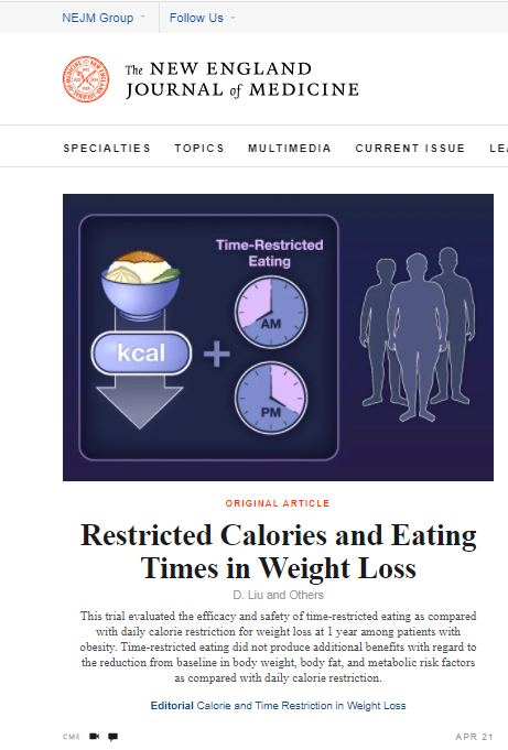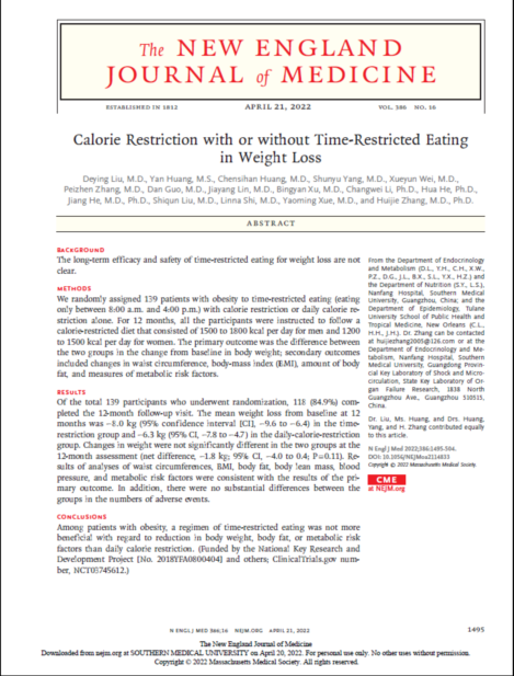 2022年4月21日,南方医科大学南方医院内分泌代谢科张惠杰团队在国际权威期刊《新英格兰医学杂志》( The New England Journal of Medicine,IF=91.245)在线发表题为 Calorie Restriction with or without Time-Restricted Eating in Weight Loss 的研究论文,并同期刊登同行评论文章。张惠杰教授为本论文的通讯作者,第一作者和通讯作者署名单位均为南方医科大学南方医院。