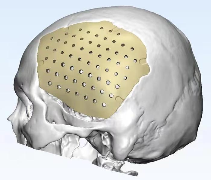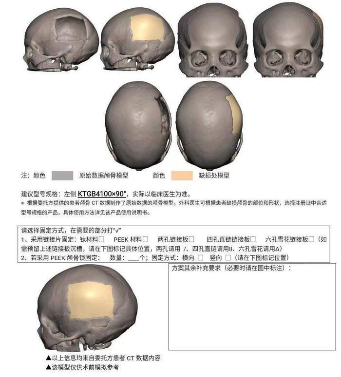 Case2 这是一例江苏患者,女,63岁,4个月前因车祸伤导致急性硬膜下血肿,手术去骨瓣减压挽救生命,肇事方全责,保险全报,家属要求PEEK材料修补,当地医院无此经验,遂找到戴大伟教授团队。颅骨板材设计方案如下,手术效果十分满意。