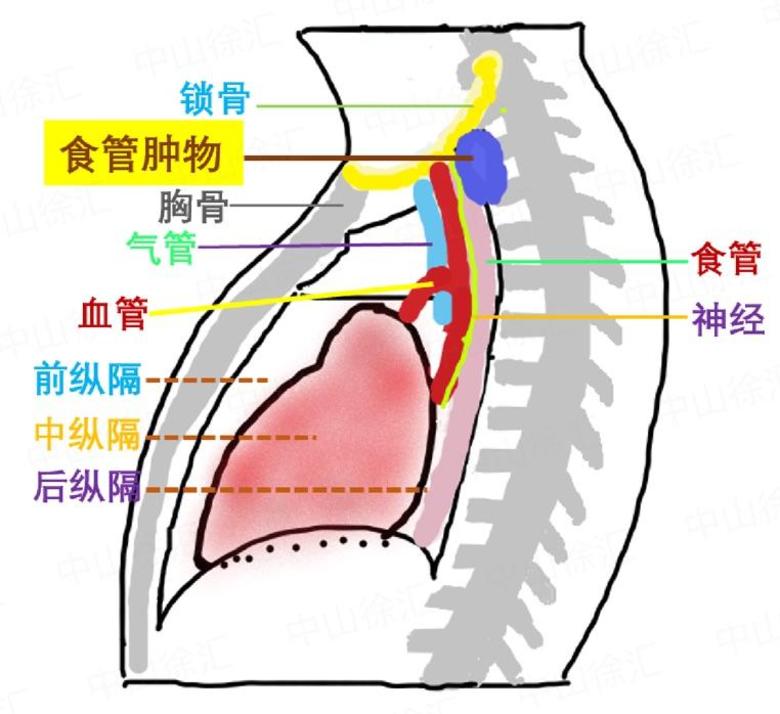 钟芸诗教授介绍:食管前方与气管相邻,后方为脊柱,其旁与心脏、大血管、神经、组织等伴随。可分为颈部、胸部和腹部。食管粘膜下肿瘤,以良性者居多,病理类型包括平滑肌瘤、胃肠间质瘤、颗粒细胞瘤、血管瘤、脂肪瘤、神经鞘瘤、囊肿等,但部分良性肿瘤仍然有恶变可能。传统外科手术切除肿瘤,需开胸进行,近几年随着科技进步,可有胸腔镜行食管粘膜下肿瘤切除。但外科手术相对手术创伤较大,风险较高。