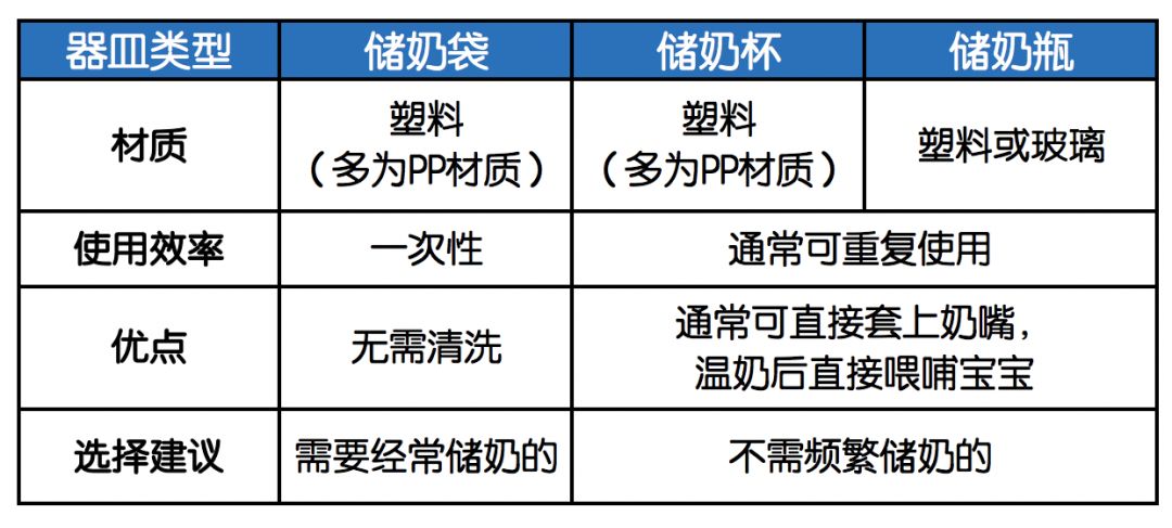 常用的储奶器皿有储奶袋、储奶杯和储奶瓶,那选哪种比较好呢?一张表告诉你▼