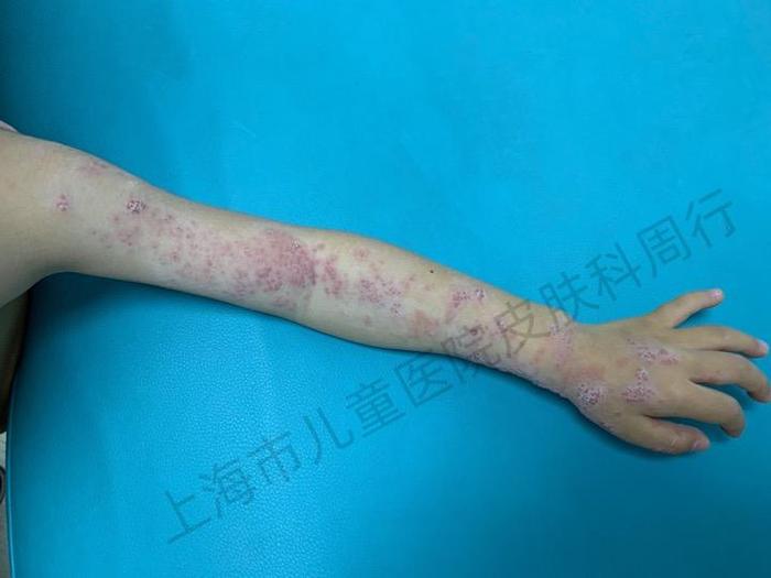 9岁女童,左臂皮疹4天,外涂炉甘石洗剂后。