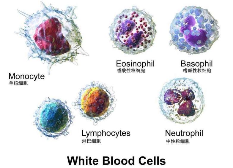 白细胞有粒细胞(中性粒细胞、嗜酸性粒细胞、嗜碱性粒细胞)、淋巴细胞、单核细胞。如下图: