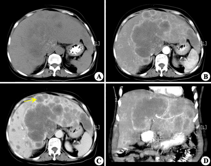 C:CT增强扫描的肝实质期;D:CT增强扫描的冠状位图像。