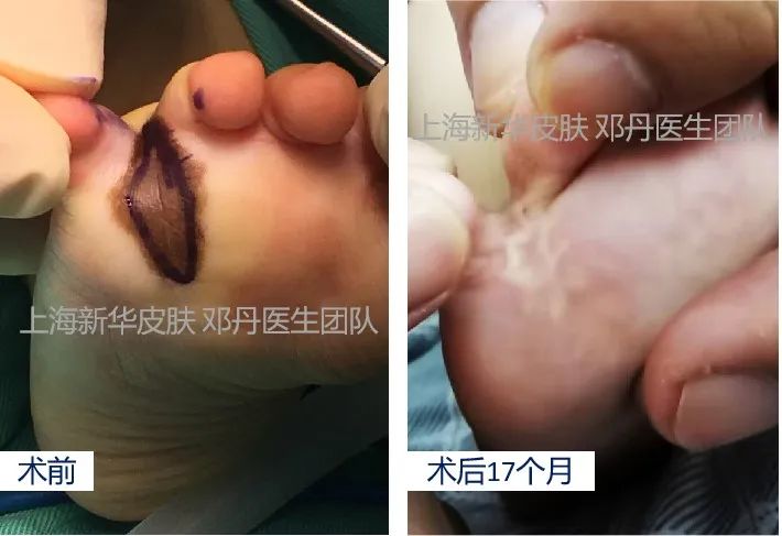 3. 掌跖部皮肤缺乏弹性,分次切除难度大;