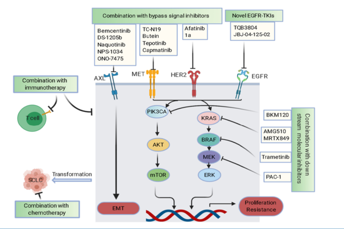 对于EGFR-TKI耐药机制的研究如图2,第一种策略是探索新的EGFR-TKIs来克服EGFR依赖性耐药,第二种策略是开发合成治疗EGFR非依赖性耐药,目前已开发出多种抗耐药策略,耐药大致分为两类。第一种策略是探索新的EGFR-TKIs来克服EGFR依赖性耐药,第二种策略是开发合成治疗EGFR非依赖性耐药。EGFR获得性突变或扩增是TKI耐药的主要因素。因此,第三代和第四代TKI最初是为了解决之前TKI治疗遇到的获得性耐药而设计的。奥希替尼成功克服了T790M获得性耐药,但不能避免获得额外突变的可能性。C797X是奥希替尼治疗中遇到的主要获得性突变,占耐药病例的0 - 29%。因此,有希望的抑制剂正作为第四代TKI出现,以造福因C797突变导致的第三代TKI治疗失败的患者。