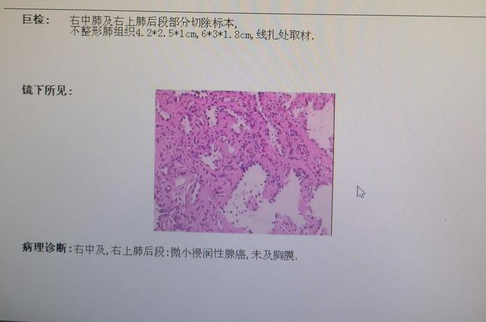 第二个女病人因为右中肺混合磨玻璃结节住院。后来我新发现一个右上肺混合磨玻璃结节。术前和病人和家属签字时说两个都像是微小浸润性腺癌。术后病理两个混合磨玻璃果然都是微小浸润性腺癌。