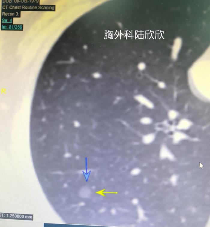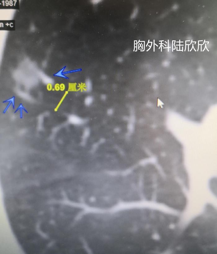 上图是中肺大的混合磨玻璃结节,三个蓝色箭头指示的是3根小血管与磨玻璃结节相连。