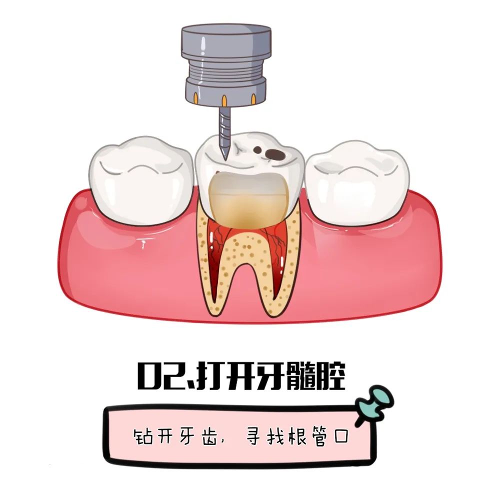 2.钻开牙齿,去除腐坏的牙质;打开牙髓腔,取出坏死的牙髓;用根管钻扩大根管;