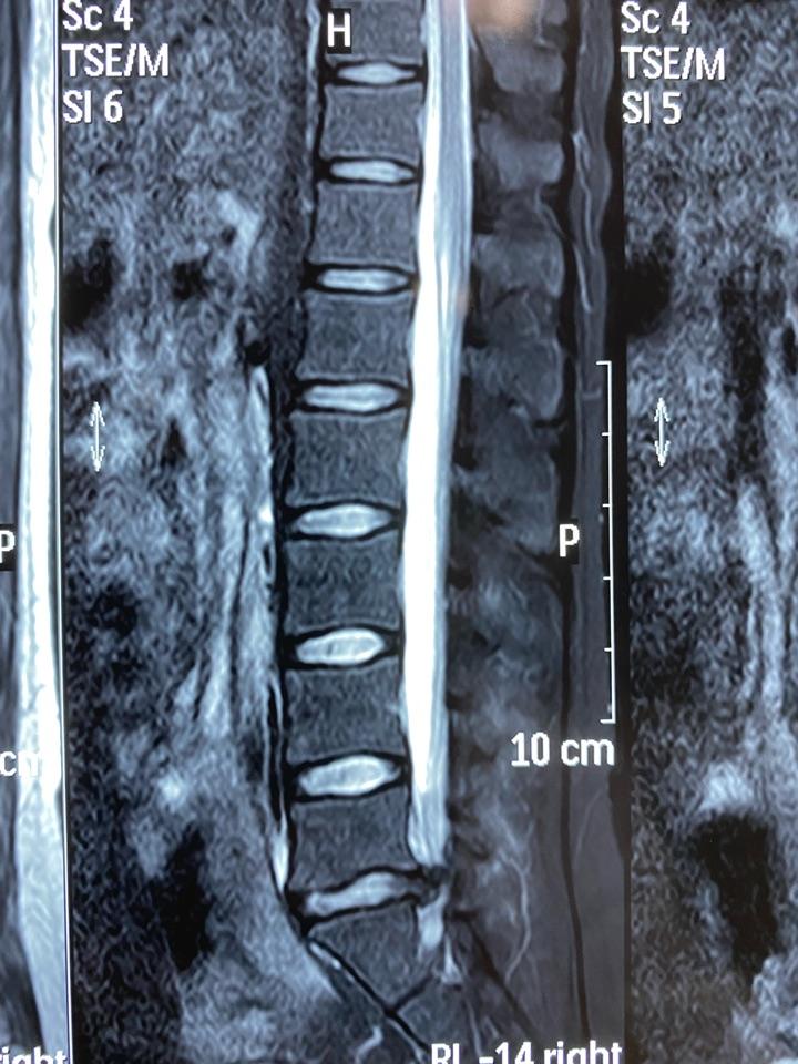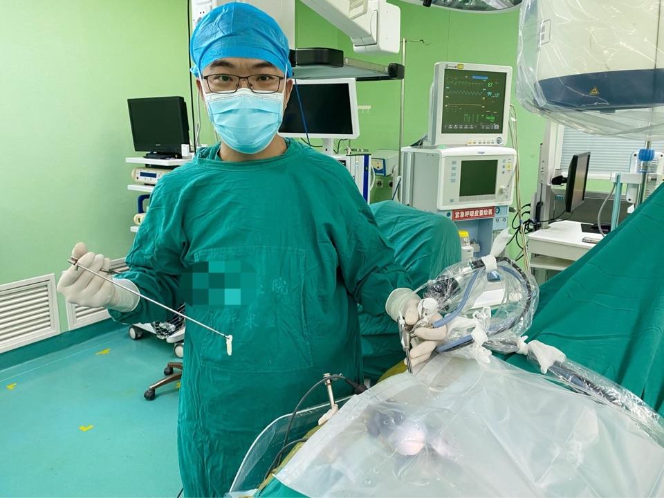 年轻患者,男性,22岁,腰痛病史3年,右下肢疼痛麻木不能站立一月余,不能平卧,靠坐轮椅20多天,当地医院给予输液、理疗等保守治疗不见好转,就诊我门诊时查体右腿直腿抬高试验15度阳性,查腰椎磁共振示:腰5-骶1椎间盘脱出,右侧神经根及硬膜囊严重受压,住院后采取椎间孔镜微创技术完整取出压迫神经的髓核组织,术程20分钟、切口0.5cm、出血约10ml,术后即刻右下肢疼痛麻木感消失,右腿抬高活动自如,术后次日正常下地行走,康复出院!