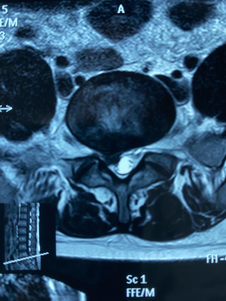 腰椎磁共振:腰5-骶1椎间盘脱出占满椎管,硬膜囊受压继发椎管狭窄