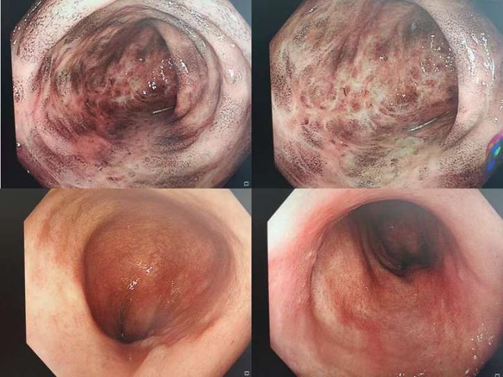 溃结患者疗效反馈 2021年04月14日 7940人阅读 返回文章列表 这位距肛60cm广泛结肠病变溃结患者,初诊肠镜下好比溶洞,血便5次伴腹痛,crp,esr,plt等炎症指标明显升高,白蛋白25g,血色素7.5g,按照常规肯定激素治疗起手,然而单纯口服中药2周大便成型,无肉眼血便,看着她好起来,4个月维持治疗至今复查,肠镜下虽有中药色素沉着,但是大量疤痕修复,黏膜愈合,临床缓解,其他指标一切如常。甚是欣慰! 顶 0 分享到: