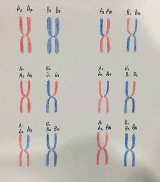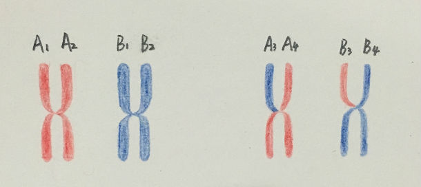 (本文中的染色体图解只是示意图,和实际情况有出入,实际染色体为双倍体,而我因为精力有限只花了单倍体。)