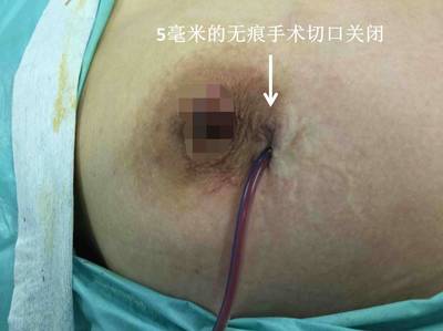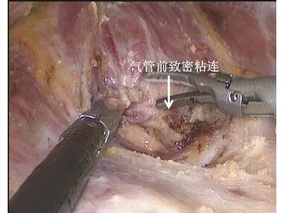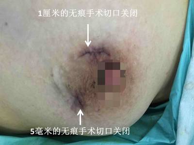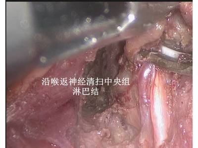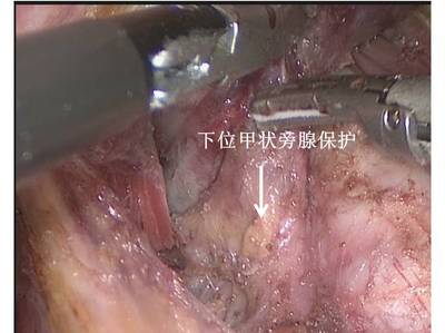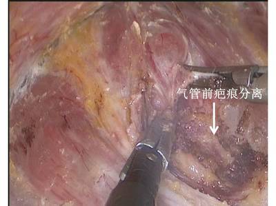 3月28日,邱伟华主任医师和吴庆华副主任医师在瑞金医院北院完成了该例全腔镜甲状腺癌根治术。由于第一次手术采用了胸乳入路,为尽量减少疤痕影响,二次手术采用经乳晕入路,沿患者双侧乳晕切开1个直径1厘米和2个直径0.5厘米的3个小切口,分别放置Trocar,通过超声刀钝性分离沿皮下游离至颈部颈阔肌下,并采用6mmHg的低压CO2建立操作空间。进入甲状腺区域后,局部粘连确实较为严重,尤其在颈前肌群(胸骨舌骨肌、胸骨甲状肌、甲状舌肌肌和肩胛舌骨肌)和气管前方,致密粘连,没有任何解剖层次。因此直接于颈阔肌深面,分离到甲状软骨下方,以甲状软骨下方气管起始部为解剖标志,找到颈白线中线,通过钝锐分离结合,以钝性分离为主,先分离粘连轻部位、后分离粘连重部位,由浅入深,逐步分离出气管,游离出颈前肌群后,通过邱伟华医生自制的针型拉钩向侧方悬吊牵引,充分完整地探查并保护大小仅2毫米的甲状旁腺,同时从甲状腺下极全程暴露出直径<1毫米的右侧喉返神经直至其入喉处,从而完整地根治性切除了左甲状腺全部腺体,并进一步沿纤细的喉返神经,廓清了右侧VI区**组淋巴结,手术仅耗时2小时,出血量小于20毫升。术后3个小切口采用胶水关闭,进一步减少了术后疤痕形成,达到更好的美容效果。