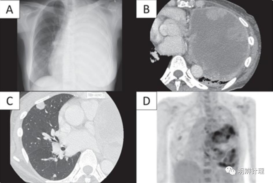 (A)胸片和 ( B ) 胸部 CT 显示左肺有一个 15 × 14 × 10 cm 的巨大肿块,肿瘤中心有广泛的低密度区域,怀疑出血和坏死; 胸片显示左肺完全肺不张。