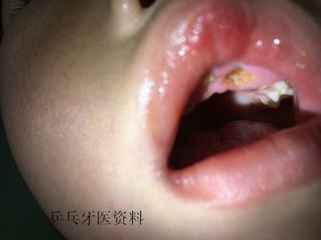 就在患儿等待全麻治疗期间,乳前牙残根突然发作急性根尖周炎,并进一步发展引起眶下间隙等严重的面部感染,病情非常危急。(见附图)