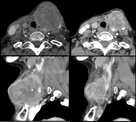房居高教授:我们的原则是:如果不是切除特别重要的结构,一般按靶向前范围去切除。像气管,靶向后虽然回缩了,我们认为在气管环间还是会残留肿瘤的,在不严重影响气管喉功能的前提下,尽可能的按照靶向前的范围去切。而对于颈总动脉、锁骨下静脉等重要结构,进行肿瘤包膜外切除,大血管能保就保。也就是对于切除后严重影响功能的组织结构,按治疗后范围去切,其他一般结构按治疗前范围切除。