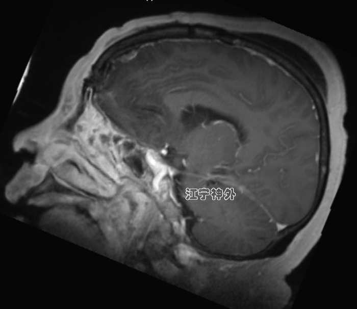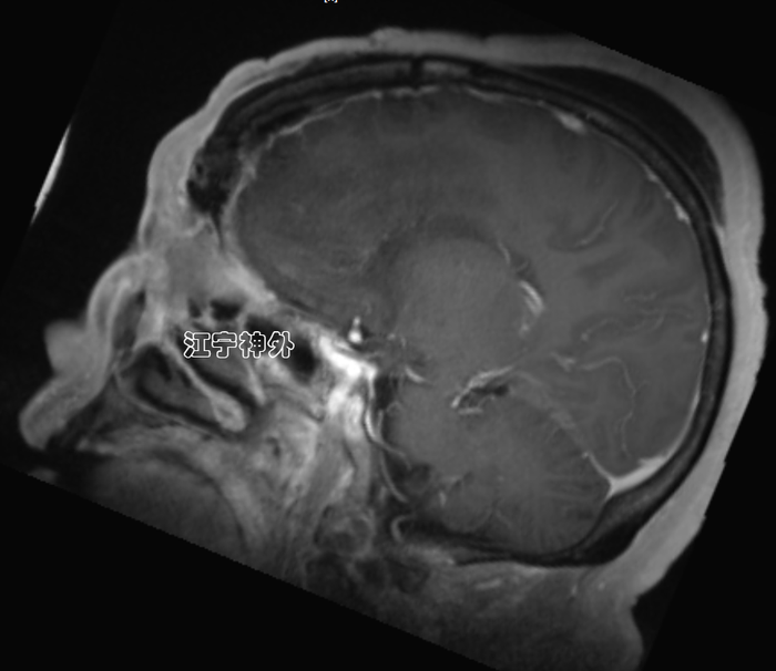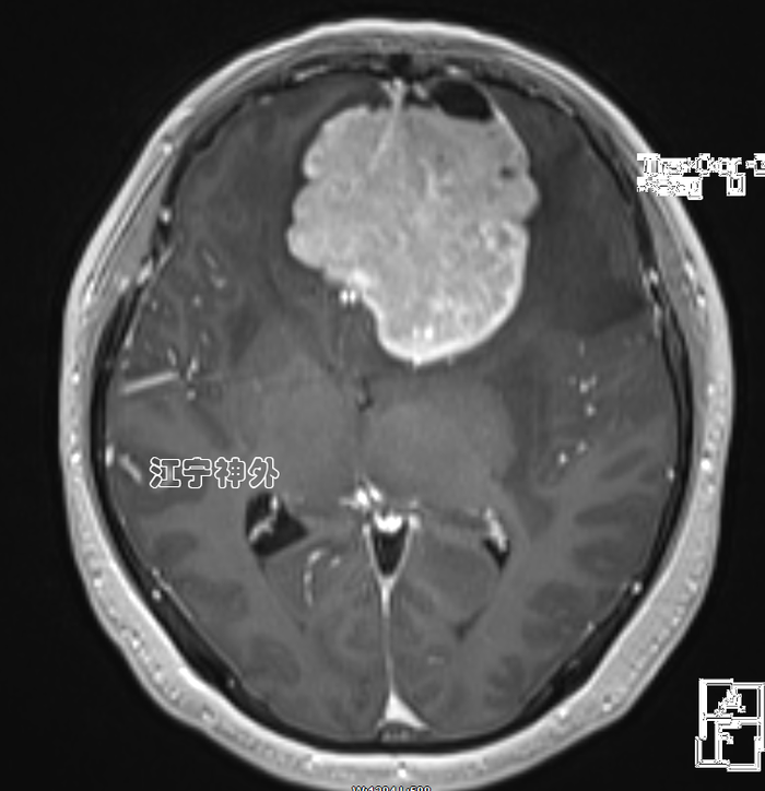 术后一周复查磁共振,显示肿瘤完全切除,脑组织水肿仍比较明显,继续用药。术后两周拆线出院,切口愈合良好,无任何并发症。术后病理提示脑膜瘤。