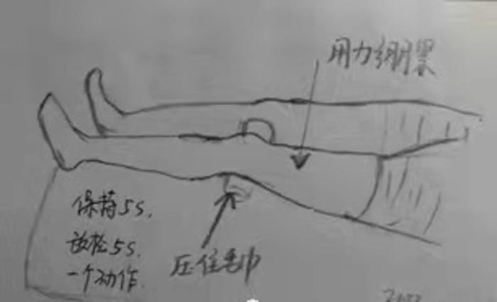 “股四头肌等长训练”指大腿前侧的肌肉有规律的绷紧和放松:可以将毛巾卷置于膝盖腘窝下方,缓慢用力绷紧,产生往下压的感觉,但是不要压下去,保持5秒,然后放松。每组10-20个,每天4-6组。