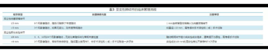 可参照表3列出的亚实性肺结节的随诊推荐方案和注意事项进行管理。