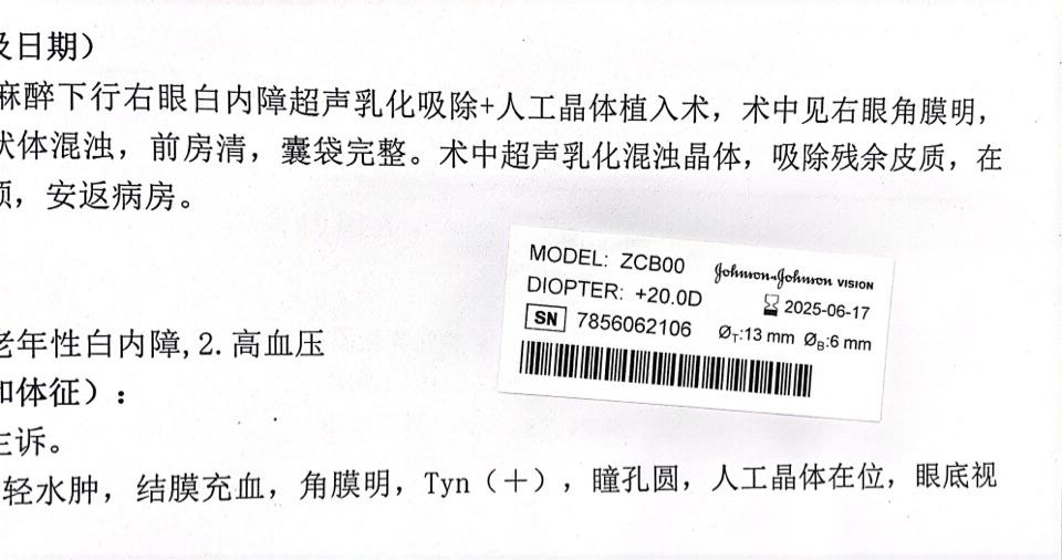 这个标签是术中放的人工晶体的标签,相当于人工晶体的身份证,显示的是人工晶体的信息,包括人工晶体是哪个厂家的,是什么型号的,是多少度数的。这个标签证明手术中放了人工晶体。