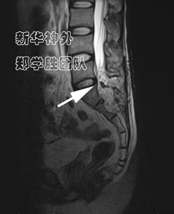 经过仔细读片,郑学胜主任判断,骶管囊肿漏口很可能在腰5骶1间隙(箭头所指),而不是在腰5上段。