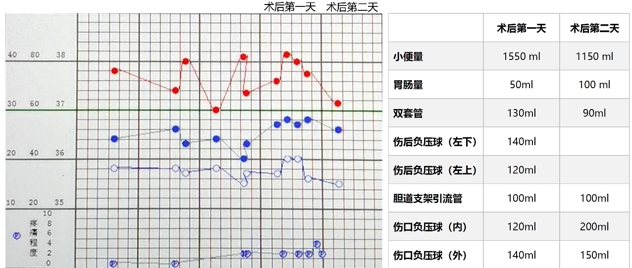 术后第一天,患者体温、脉搏、呼吸正常,血压112/60mmHg,心率72-80次/分,尿量正常,胃肠减压通畅,腹腔引流为淡血性。状态平稳,恢复如期。