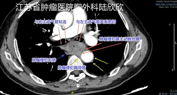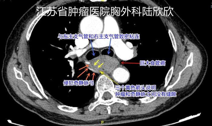 上图,棕红色箭头指示的是巨大食管癌。四个橙色箭头和3个黄色箭头之间指示的是奇静脉弓,与肿瘤之间似乎有一道细细的缝隙。实际,手术中看,肿瘤侵犯奇静脉弓。手术中切除了奇静脉弓。两个蓝色箭头指示的是肿瘤与左主支气管和右主支气管关系很密切。手术中,肿瘤没有侵犯左主支气管和右主支气管,只是靠的非常近。
