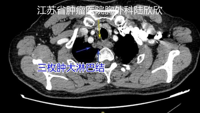 三枚增大的右气管食管沟淋巴结,位于脊柱右前方,从右边手术较为容易,这次手术从左边手术难度较大。淋巴结旁边有喉返神经。术后声音嘶哑与切除这几个淋巴结有关。