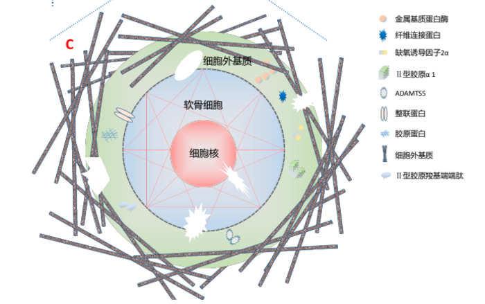 细胞外基质主要由Ⅱ型胶原蛋白和蛋白多糖构成,Ⅱ型胶原在软骨内交织成三维网状,被聚合型蛋白多糖缠绕组成复杂的网络结构,可保持软骨的稳定性并支持其结构完整性。而在OA病理环境下,细胞外基质的丢失就成了引起关节软骨机理退化及关节结构变形扭曲的原因之一。