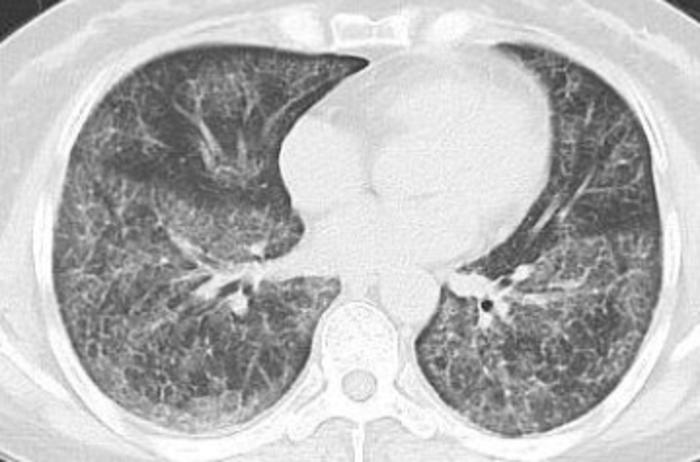 双肺弥漫性磨玻璃影,呈现地图样分布,可铺路石样改变。