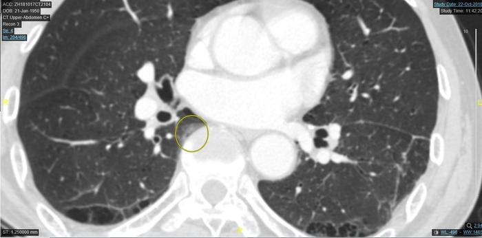 上图圆圈处的脊柱旁的肺突入纵隔处的一个肺磨玻璃样影。不是圆形或椭圆形。这个地方有些病人会有一个磨玻璃样影子。本图的磨玻璃样影比一般病人影子深一倍以上,一般病人此处的磨玻璃影子比此图浅得多。
