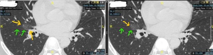 左图上边的黄色箭头指示的是磨玻璃结节,椭圆形30毫米左右。下边的黄色箭头指示的是磨玻璃结节紧贴肺动脉。两个绿色箭头指示的是中下叶交界处的肺裂。可见磨玻璃结节已经累及肺裂。