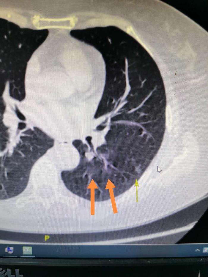 上图左边两个粗的橙色箭头指示的是肺内疾病稍发白的云絮状影,没有明显边界。右边细的黄色箭头指示的是一个磨玻璃结节,有明显边界,而且密度较高,看起来白一些。