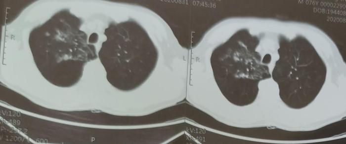 此病人痰中检查出结核菌,确诊为肺结核,具有传染性。这是服药前的CT。