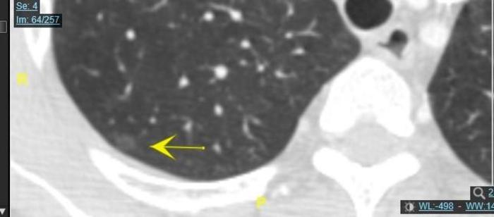 右图上边的黄色箭头指示的是磨玻璃结节,椭圆形30毫米左右,内部密度不均,有一些小空泡样改变。两个绿色箭头指示的是中下叶交界处的肺裂。可见磨玻璃结节已经累及肺裂。
