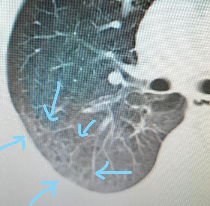 胸膜下长条状磨玻璃影,里面有小空洞。属于间质性肺炎的一种表现。